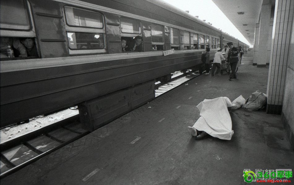 2003年春运期间,广州火车站,一名在车厢中猝死的乘客被抬到站台上。