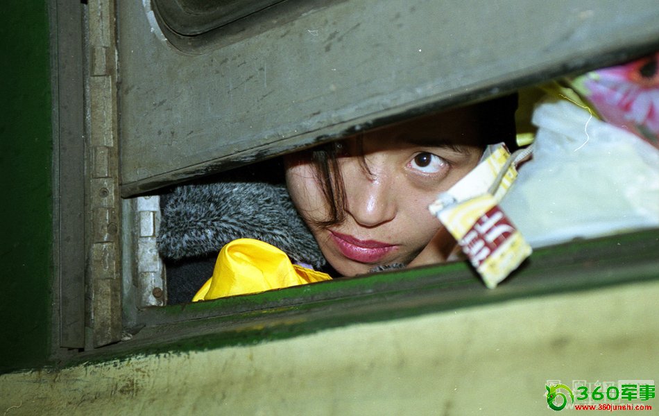 2001年春运,广州,一列即将出站的列车上,拥挤的车厢捏,一名女乘客透过车窗缝隙向外张望。