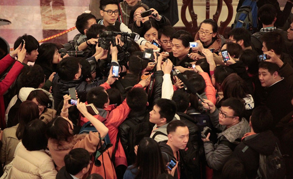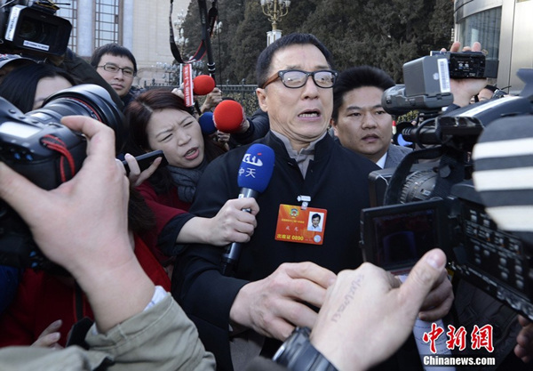 3月3日下午,全国政协十二届一次会议在北京开幕,全国政协委员成龙面对众多记者的层层包围,连称“求求你们”。
