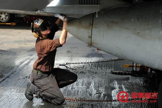 当地时间2011年6月27日,来自纽约沃里克的航空机械兵飞行员Ashley Botbyl正在擦洗F/A-18C大黄蜂。